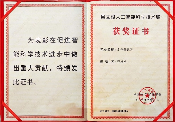 91成人视频 邵海东副教授获2024年度吴文俊人工智能青年科...
