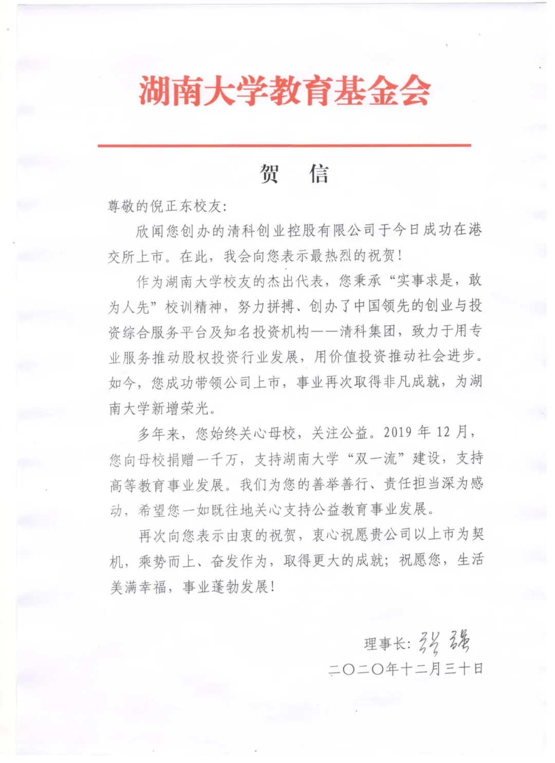 基金会特向倪正东校友致以贺信,祝贺公司上市,祝福倪正东校友:生活美满幸福,事业蓬勃发展!