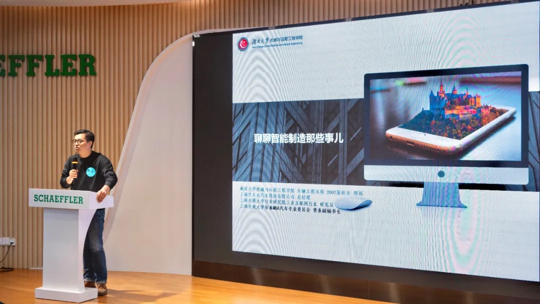 第三位分享嘉宾是艾车克汽车总经理、03级郑远校友。郑远校友首先结合自己的工作经历,为大家分享了他是如何将自己的兴趣点发掘出来,并将之作为自己所专注的职业。随后他重点向大家详细介绍了智能制造的发展历程、智能制造的国家战略以及未来制造的新形态,帮助校友们系统、全面地了解了智能制造的发展趋势。