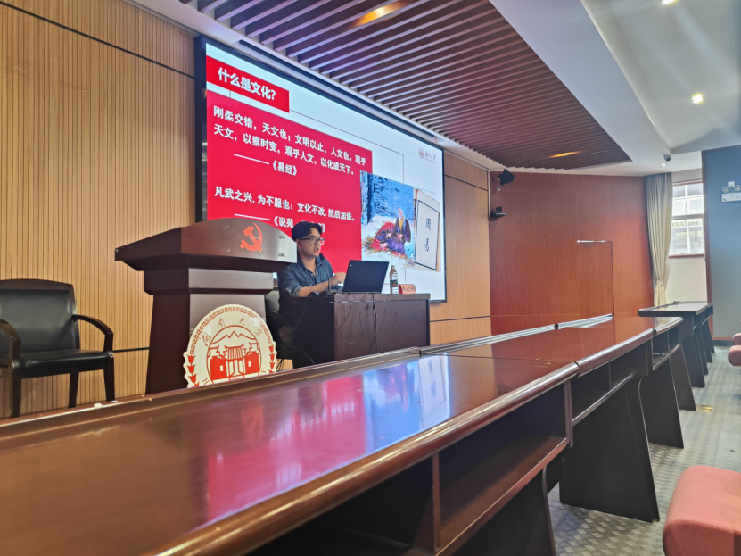 博士理论宣讲团团长刘邦志讲授第三堂党课。刘邦志从“文化自信何以是?”“文化自信何以能?”“文化新人何以为?”三个问题出发,同时联系了习近平总书记2024年3月18日考察湖南第一师范学院时的讲话,呼吁各位学子在百年未有之大变局中奋发报国。