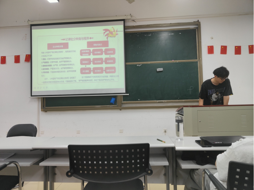 会议由张宁主持,由陈历弘同学向大家展示了加强党纪党规学习、保持自身廉洁的重要性。会议学习贯彻习近平总书记关于党纪学习教育的讲话;提出要进一步深化对忽视党纪、违反党纪问题危害性的认识;提出加强遵守纪律的自觉,自觉同以习近平同志为核心的党中央保持高度一致;会议中还提出需要学习贯彻《中国共产党纪律处分条例》,从日常和学习生活中开始。