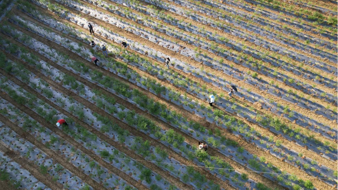此时天刚泛起鱼肚白,当我们抵达种植基地时,已有数十名村民在辣椒田地里采摘黄辣椒。在简单了解采摘目标后,我们加入了他们的采摘行动。