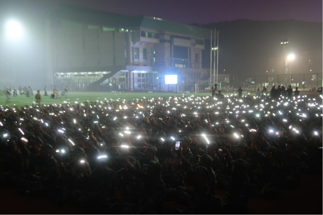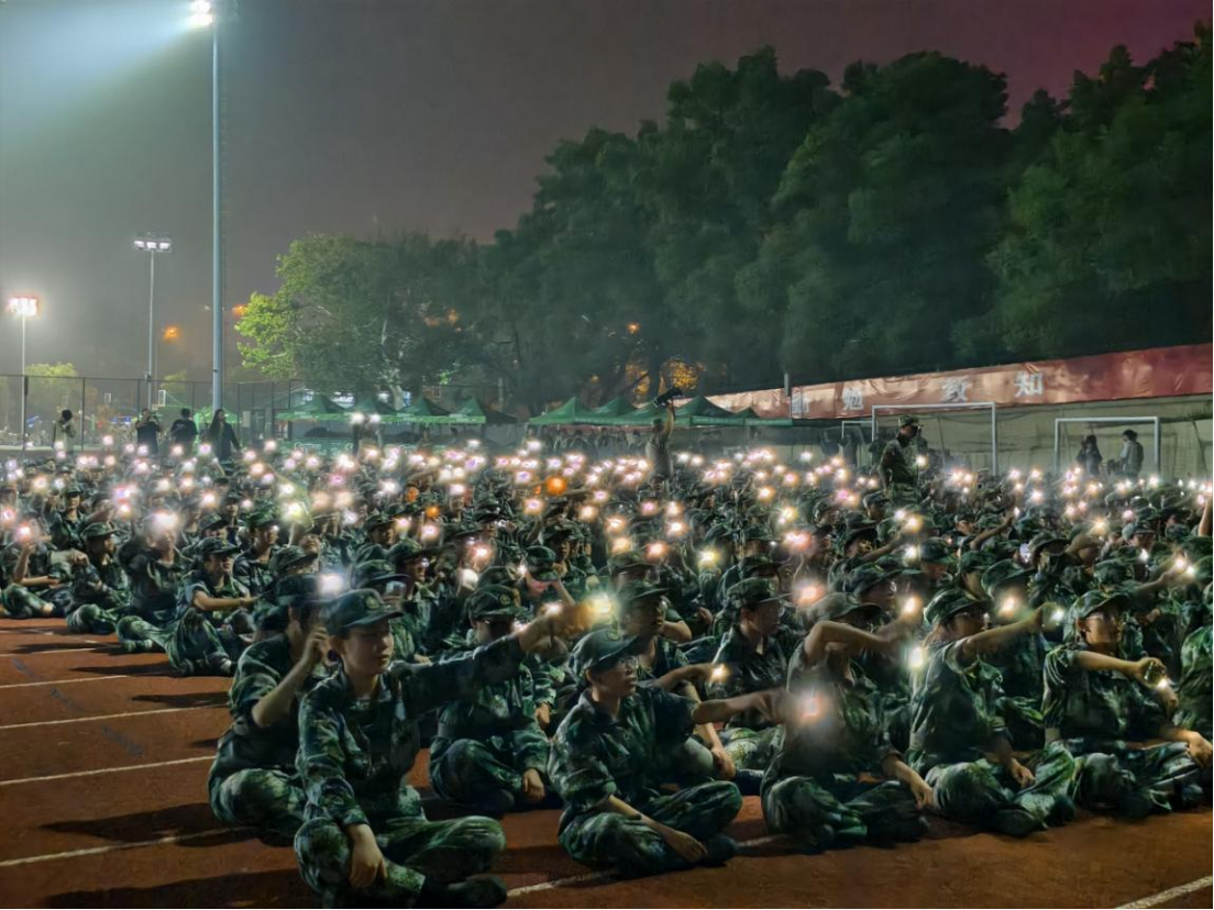 随后,全体新生齐声高唱《强军战歌》《逆战》等励志歌曲,歌声嘹亮,气势如虹。歌声中,同学们不仅释放了训练的疲惫,更激发了内心的斗志与豪情。一句句响亮的口号在夜空中回荡,展现了同学们不畏艰难、勇往直前的精神风貌。