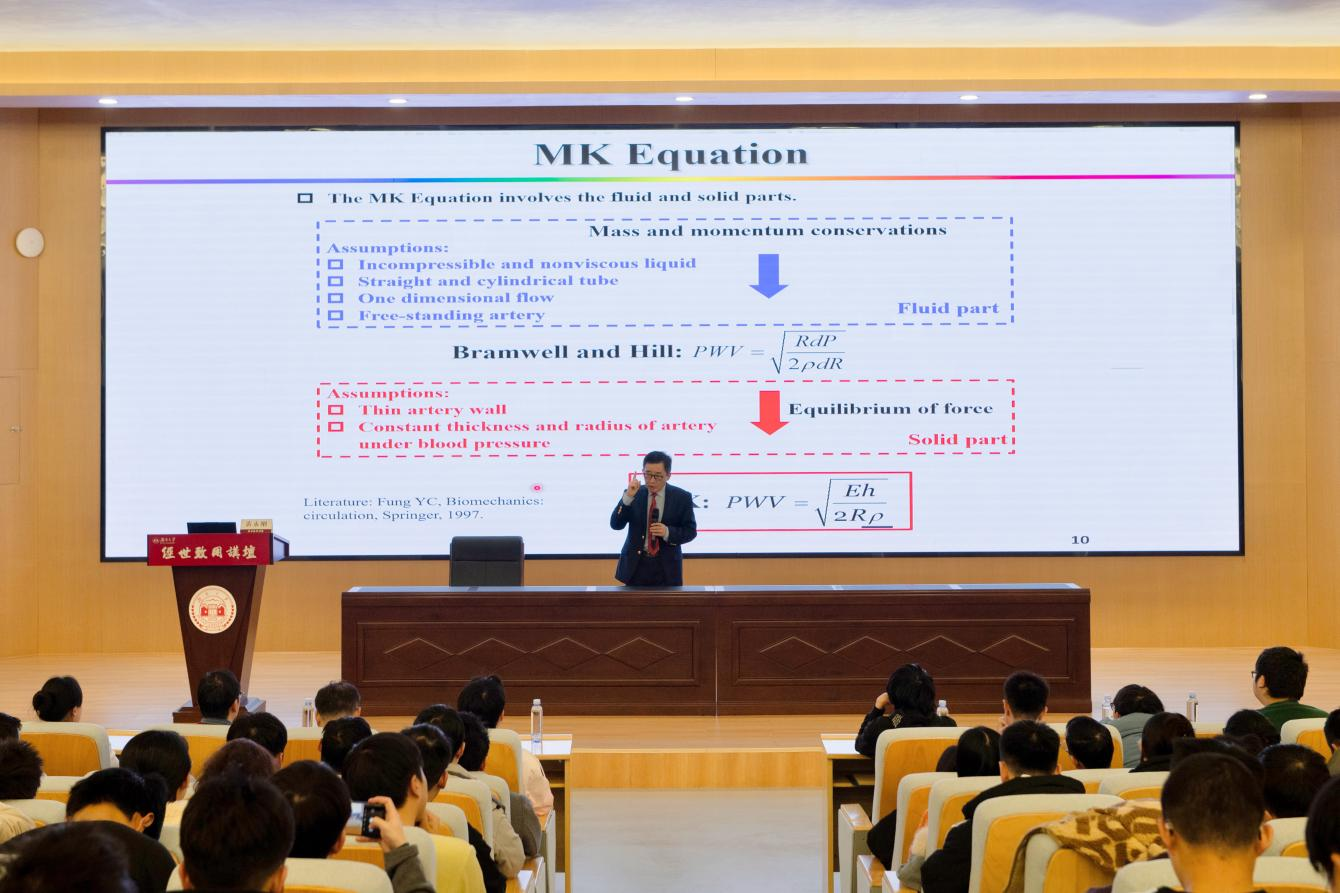 黄永刚深入探讨了连续血压监测的研究背景和意义,结合自身研究,与到场师生分享了人体动脉血压与脉搏波速度之间的关系。他指出,传统的血压监测方法虽然广泛应用于临床,但存在测量效果受限、可能造成组织损伤以及对患者活动自由度产生影响等问题。黄永刚及其合作者利用超弹性模型描述人体动脉材料本构,基于弹性力学理论建立一个简单公式用以描述血压和脉搏波速度之间的关系,并进行了商业推广,为无袖带、无创连续血压监测提供了一种具有广阔前景的替代方法。他认为,学术探索和科学研究在现代社会中扮演着至关重要的角色,不仅是推动科技进步的驱动力,也是培养学生解决问题能力的关键途径。