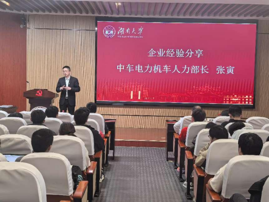 中车株洲电机有限公司人力资源部部长张寅结合自身择业和就业经历,鼓励同学们要有目标、有梦想。他认为书本上的知识更需要通过实践去检验,学历与学校只是敲门砖,核心是学习力与进取心,强调了实践和经历的重要性,希望同学们要早日走出家庭和学校的象牙塔,结合自己的规划在人生的各个结点做最优的选择。他谈到“不平凡的英雄都是在平凡的事业中间积累起来的”,鼓励大家做好每一件平凡的事。