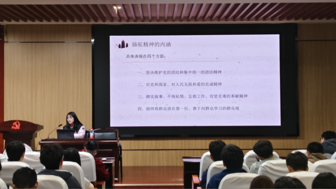 博士理论宣讲团的张嘉怡、彭祎两位主讲。张嘉怡以"党和人民的骆驼——任弼时"为主题,深入阐释了骆驼精神的深刻内涵及其时代意义。彭祎则以"农民运动中的毛泽东"为题,结合《湖南农民运动考察报告》,带领学员领会"实事求是"的建党精神。