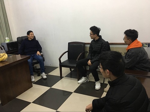 国家汽车重点实验室322室,赵宇鹏、吕凌泰、刘玉琢、孙玉四位预备党员前去拜访老党员刘子健同志。在改革开放40周年之际,四位同学围绕改革开放的主题与老党员进行了放松而又密切的交流。