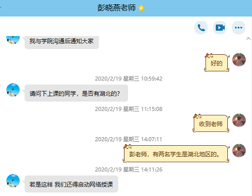 2020年1月20下午,钟南山院士证实了新型冠状病毒肺炎的“人传人”现象。在得知疫情的严重性之后,彭晓燕老师第一时间给她的学生们通了电话,询问了他们的身体健康情况和家人的健康情况,并鼓励他们不用过多担心,保持良好的心态,做好自身和家人的防护工作。彭晓燕老师也多次通过线上聊天等方式向学生予以关心。