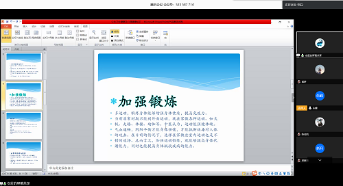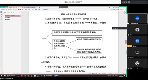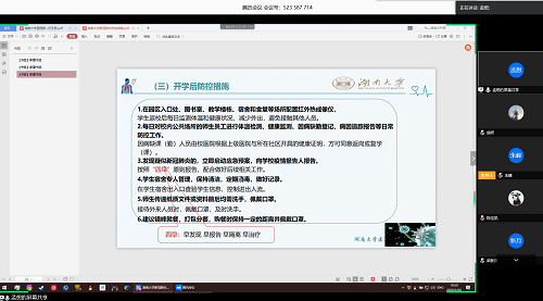 班主任余剑武老师对班会进行总结,从疫情情况、学习、心理和安全防护等方面展开说明,引导同学们坚定抗“疫”必胜信心、为国家做力所能及的贡献;分享自己在家积极运动的例子,特别提醒同学们重视锻炼身体,安排好学习生活。学工部龚翔老师对组织参与会议的师生表示感谢,建议同学们将精力转向“三个投入”。一是将精力投入到在线学习和自主学习中,增强自律性;二是投入到做好健康档案的相关工作中,提供及时、准确、全面的健康信息;三是投入到“爱国力行”的主题教育活动中来,积极参与疫情防控工作,展现湖大学子勇于担当的精神风貌。