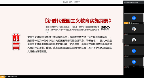 班委精心设计班会流程,四位同学率先领学,积极宣传疫情防控知识。班长朱峰带领大家学习领会习总书记关于疫情防控重要指示精神,团支书马乐晗宣讲《新时代爱国主义教育纲要》内容,增强同学们的必胜信心和爱国热情;心理委员安莊传递疫情期间身心健康理念和防控知识,安全委员孟想讲解《91成人视频