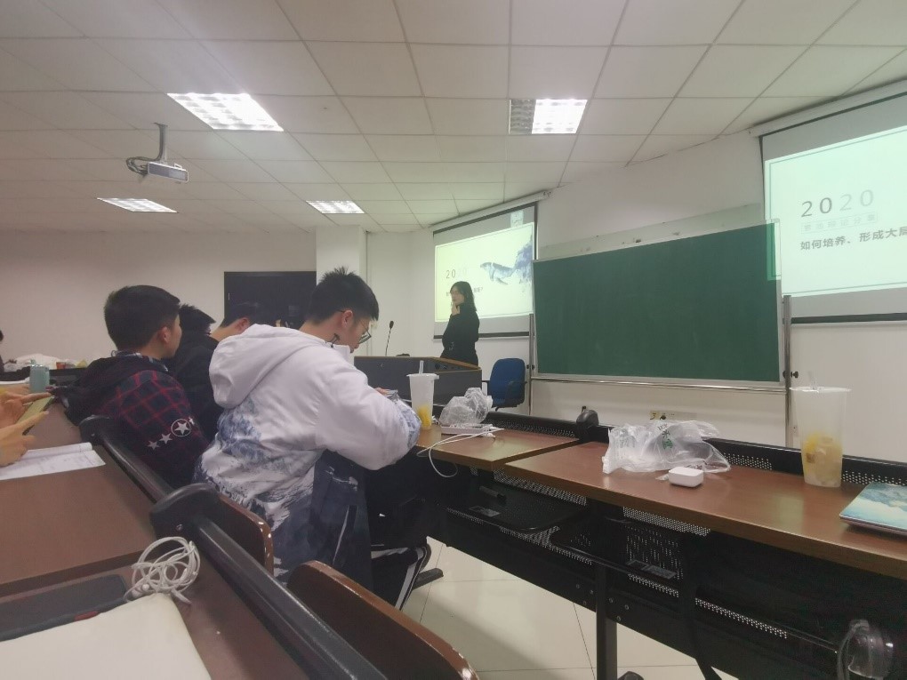 后半场素池学姐以“如何培养、形成大局观”为主题进行了经验分享。她以“如何听一场分享会”切入话题,告诉队员们倾听并不是因为主讲人的名誉、资历等其他因素,而是能真正从中吸收所需要的知识养分。不同于大多数人关注的论点和技巧等,素池学姐强调了个人在辩论赛场上的重要意义。辩论是一场另类的交流,涉及到与第三方听众、对方辩友和队友的交流,因而讲述的方法尤其重要。关于与第三方听众的交流,素池学姐提出了“社会知觉”这个名词,现身说法讲述了个人经验与大众普遍认知的差异,并结合实际情况提出了对应的应对措施。同时用注意力轨迹的发展提示辩手们采取何种讲述方式更能吸引大众注意力。关于与对方辩友的问答,素池学姐告诉队员们在对方回避问题时的正确方法。她强调,最关键的一点是思维的统一,队员之间要加深对辩题进行深入全面的理解,经过充分的沟通交流、分工配合达成一致,提高论证效力。