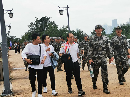 早晨6点35分,同学们早早的于天马公寓篮球场集合。列队点名后,队伍即刻出发步行前往湘江。清晨的湘江薄雾弥漫,一丝丝清幽笼罩在江畔,远处的高楼穿梭在云雾间,近处的绿树摇曳于水岸。同学们沿江列队行进,在教官的带领下时而疾走时而慢跑,远望似一条紧贴湘江,时紧时疏的绿色飘带,整齐之中透出动感,秩序之中饱含激情。清晨,迷雾,沉默的战士们,以行动绽放青春的灿烂光彩。