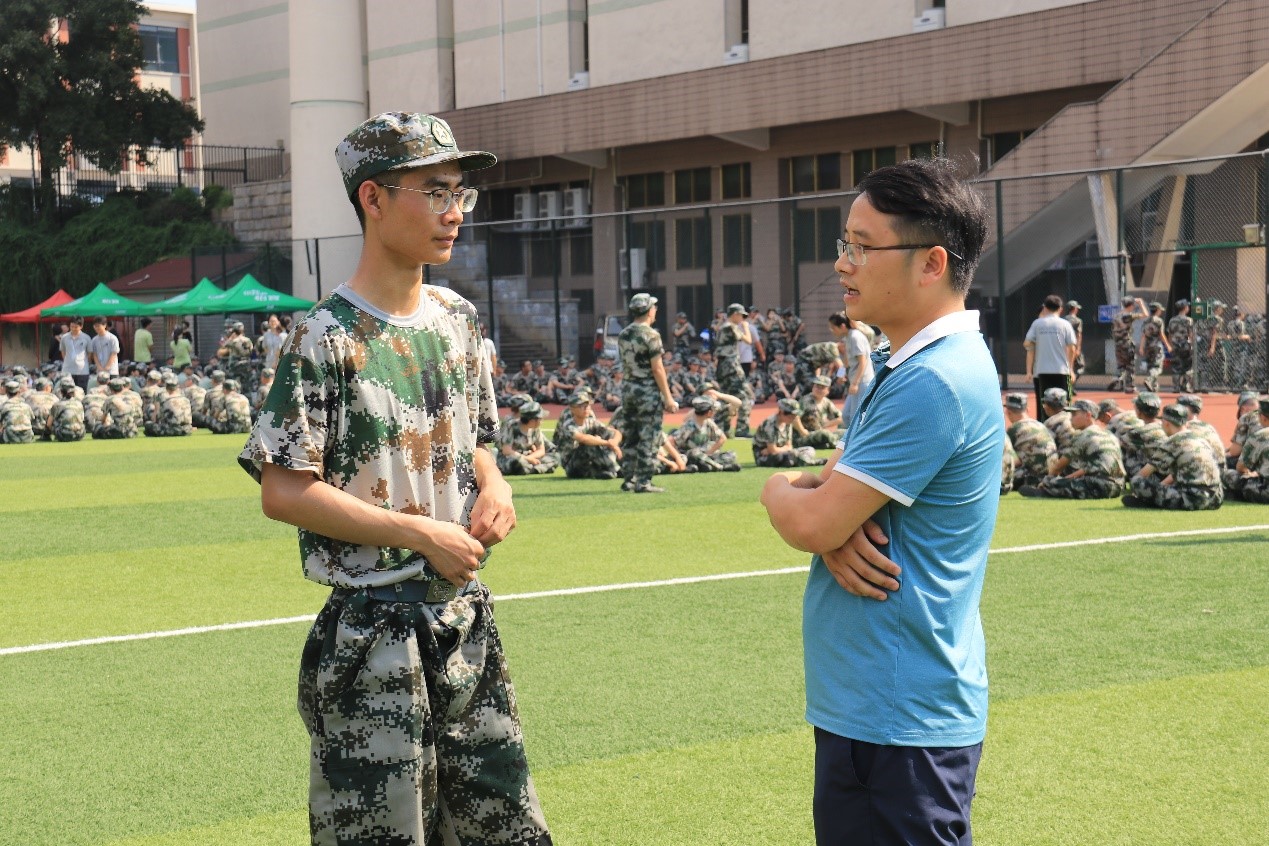 随后,张凯老师也和教官交流了第一天的训练情况,了解了班级的纪律情况和训练积极性。在看到班内新生军训休息期间的精彩表演后,张凯老师相信智能制造班的新生会学习也有才艺,在军训之余也能通过一些娱乐活动获得一个更积极昂扬的军训状态。