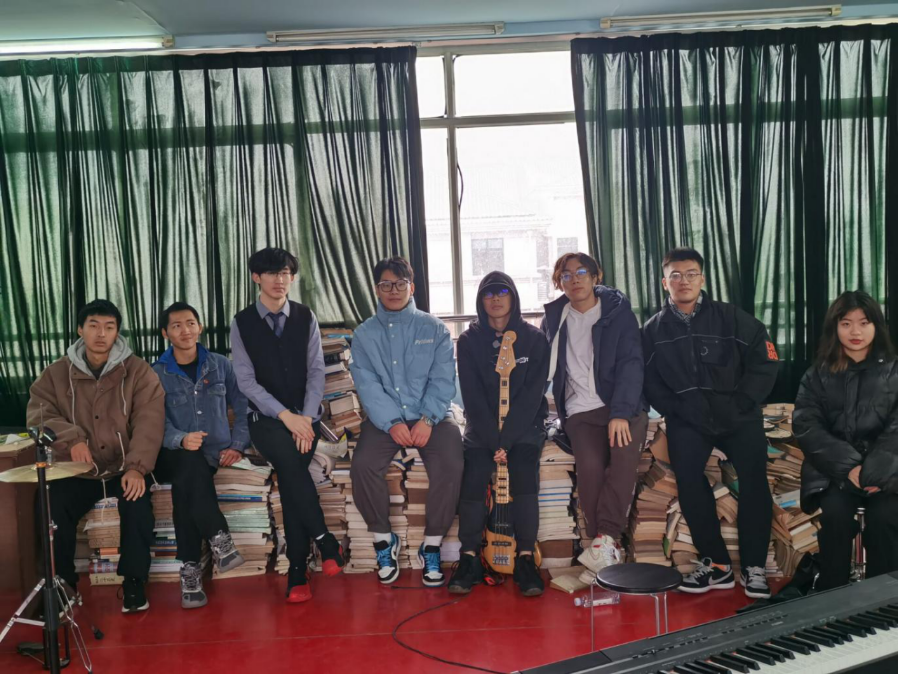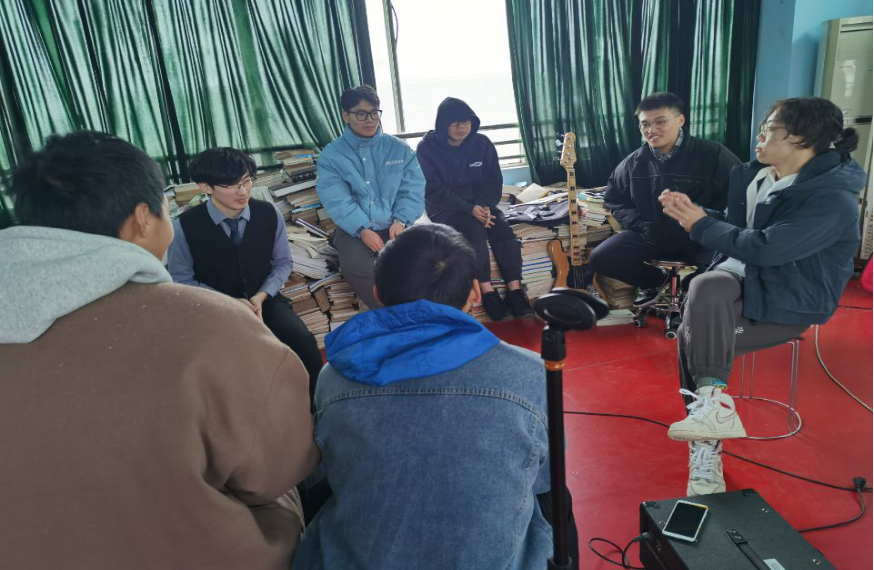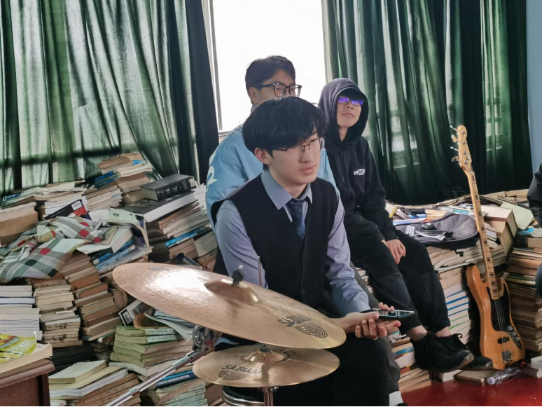A:很简单,就是喜欢听乐队的歌,喜欢乐队的文化。在来到乐队之前我认为自己挺厉害的,来到乐队之后发现厉害的人其实有很多。意识到了关键是找准自己的位置,发挥好自己的作用,而不是一味地追求自我。至于我们的乐队名为什么叫“一点四十”,是因为在活动室门口的钟表坏了而且刚好指着1:40,于是一支叫“一点四十”的乐队就诞生了!