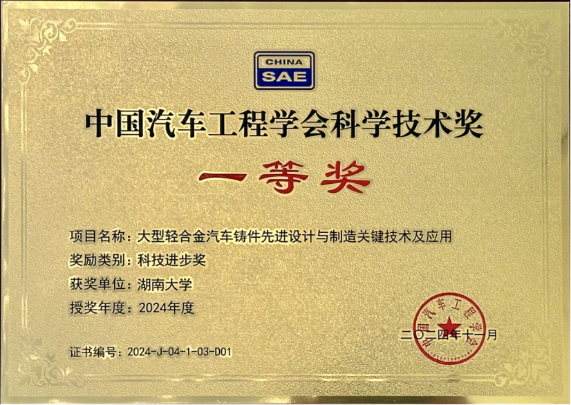 整车先进设计制造技术全国重点实验室主任徐世伟教授主持完成的“大型轻合金汽车铸件先进设计与制造关键技术及应用”项目荣获2024年度中国汽车工程学会科学技术奖一等奖。