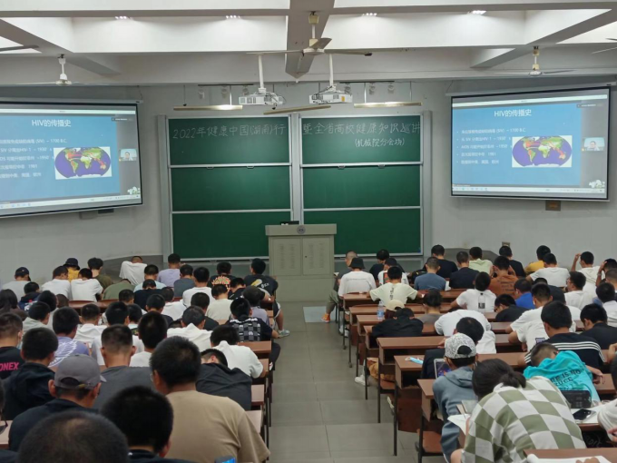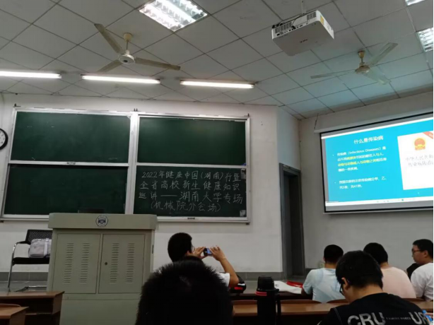2022级新生在复临舍教学楼参加了健康中国(湖南)行暨全省高校新生健康知识宣讲活动。宣讲老师围绕传染病的知识,深入浅出、内容鲜明地向同学们介绍了多种传染病的相关知识,特别是艾滋病的预防知识。同学们受益匪浅,收获颇丰。