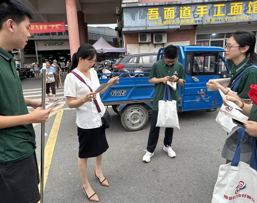 市场内灯光明亮,环境舒适,团队同学们向不同摊位的商户们和路过的居民分发“推普”宣传单并邀请其填写调查问卷。商户们都非常热情,积极配合同学们的调查,为团队提供了宝贵的反馈。他们大多说方言,能听懂普通话,但与外地人交流略有障碍;对推普活动十分热情,对学好普通话有信心。