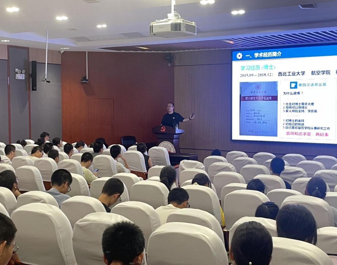 邵海东以《学习经验分享:从本科到现在》为题展开讲授,他根据自身经历从“学术经历简介”和“科研经验分享”两个方面为学生指点迷津,帮助同学认识自我、规划未来。他介绍了自己的本科及研究生经历,提醒同学们应该提早布局,及时预习复习,同时他告诫同学们科研需坐冷板凳,需要百折不挠,需要在反复修改锤炼中完善。他希望同学们在大学期间能够做一个积极向上正能量的人,遇见问题能够独立思考,切忌盲目随从。