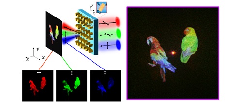 超构表面通过调整亚波长结构的尺寸、形状和排列,可以实现电磁波的波前几乎任意调控,开辟了设计光学元件的新范式。基于超构表面的器件的性能甚至可以超过传统折射元件的性能,因为可以在亚波长像素中实现更极端、任意和多路复用的波前。例如,可以通过各向异性结构或交错子单元特定地布置在2D平面中以获得波长多路复用器件。然而,等离激元纳米结构的低效率、严格入射偏振要求、通道之间较大串扰、额外角度自由度和菲涅耳全息图读出的复杂性之类的缺点导致多波长和宽带光学器件的性能降低。