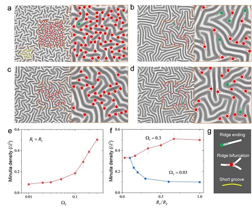 随着载荷增加,表面形貌最终演化为迷宫状失稳形貌。迷宫失稳形貌与指纹类似,是独一无二且不可复制的。在模拟中或前人的实验中没有任何两个迷宫形貌是完全相同的。这种独一无二的性质使得迷宫形貌成为了一种有前景的防伪策略。与指纹类似,迷宫形貌存在大量的细节点,比如终结点、分叉点、短沟回等,这些大量、无规则的细节点组成了独一无二的迷宫。细节点的密度是衡量防伪等级的一个重要指标。研究发现,曲率的大小及各向异性程度很大程度上决定了迷宫形貌细节点的密度,因此可以通过调控系统的曲率对迷宫形貌的防伪等级进行调控(图2)。该工作系统研究了曲率对表面失稳形貌演化的影响,不仅有助于理解自然界中曲面系统形貌形成的机理,也可应用于一些功能表面或器件的设计。