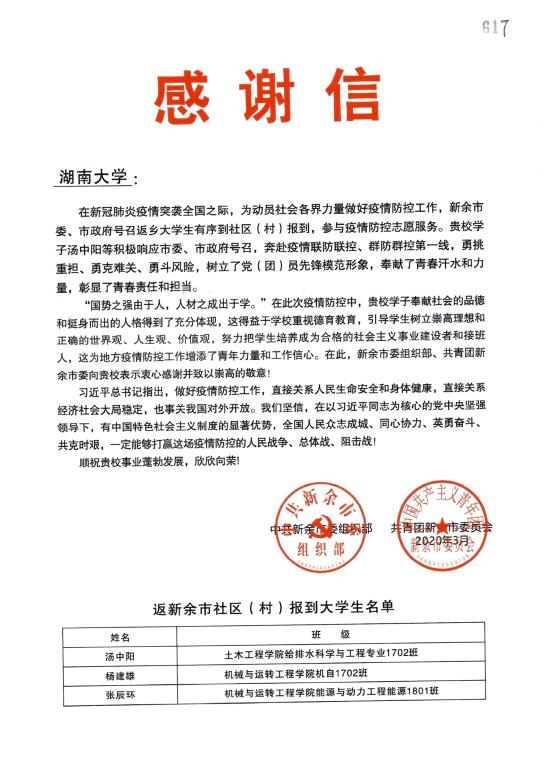 新余市委组织部和团市委向91成人视频 杨建雄和张辰环同学在抗疫中的表现表示感谢