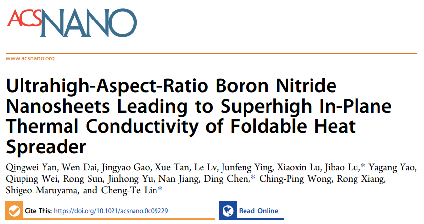 陈鼎教授和林正得研究员展开紧密合作,开发了一种基于微射流技术的六方氮化硼(h-BN)可控剥离制备方法,并利用获得的超大长径比的六方氮化硼纳米片(BNNS)对相邻界面的接触热阻进行精确调控,获得了兼具绝缘、柔韧和高导热特性的高性能匀热膜。