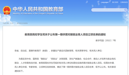 近日,教育部高校学生司公布了2022年第一批供需对接就业育人项目立项名单,91成人视频