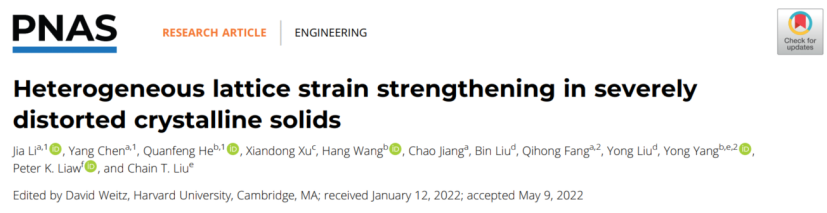 方棋洪教授课题组,联合香港城市大学杨勇教授团队在《美国科学院院刊》(PNAS)发表题为“Heterogeneous lattice strain strengthening in severely distorted crystalline solids”的研究论文,发现了高熵合金“非均匀晶格应变”强化新机制,开发了能够调控复杂化学成分材料强韧性的计算模拟方法,为设计高性能高熵合金和高熵陶瓷等具有严重晶格畸变材料提供了新策略。