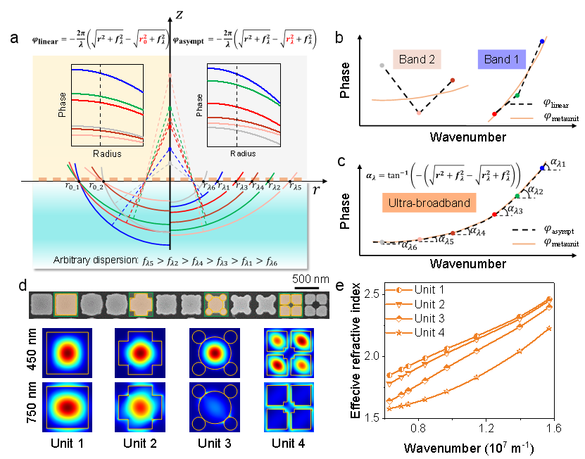 超构表面是纳米光子学领域扩展最快速的前沿分支之一,它有望取代诸多大规模应用的折射光学元件,并创造全新的功能,从而彻底改变光学领域的面貌。由介质纳米结构组成的超构表面为实现光学波段色散调控元件开辟了新的范式,但是利用单层超构表面实现可自由定制的色散调控仍面临巨大挑战,而且带宽严重受限。该研究提出了一种更通用的渐近相位补偿方案,该方案能更好地匹配纳米结构的本征相位色散特性,以解决线性相位补偿方案在任意色散调控设计中存在较大误差的障碍,尤其适用于超宽带设计中。