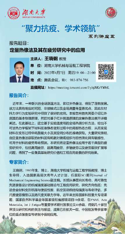 近年来,一种新兴的全场测温方法,即红外热像法,得到了蓬勃发展。该方法具有响应时间短、非接触式以及全场测量等显著优点,因此在材料力学行为实验研究中得到了很好的应用。本报告将首先简要介绍红外测温的基本物理原理,然后对基于红外测温原理的定量热像法展开详细阐述。在此基础上,建立基于实验温度场的全场热源分析方法,给出不可逆热力学框架下材料在准静态变形过程中的局部热态方程,从而实现材料在变形过程中耗散能大小及其空间分布的准确获取。大量研究表明,由定量热像法获取的材料固有耗散对微观组织与损伤演化具有敏感性,可用于材料的疲劳寿命预测。本研究将定量热像法应用于若干典型的疲劳研究中,包括高周疲劳、超高周疲劳、多轴疲劳以及疲劳裂纹扩展等问题,得到了一些兼具基础研究价值和工程应用前景的研究结果。