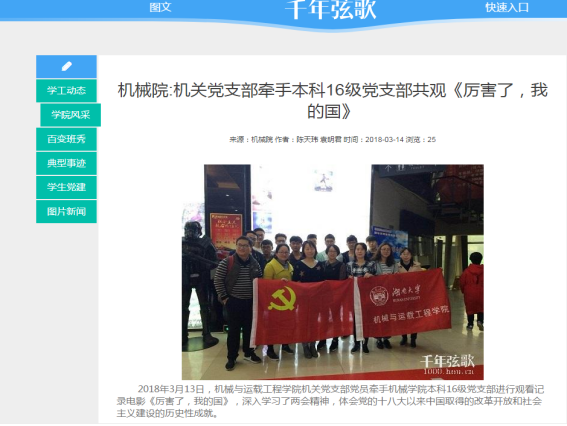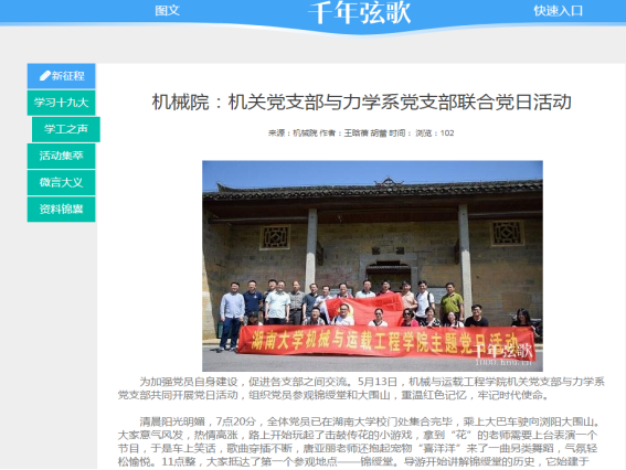 支部重视用党的理论知识武装干部,支部书记带头组织学习《党章》、《廉洁自律准则》、《纪律处分条例》等党内最新文件,加强思想建设、组织建设, 深入开展了“两学一做”等专题教育活动,营造了浓厚的学习氛围,提升了党员干部的思想觉悟。支部党员在经常受到理想信念教育、党性教育、党的优良传统作风教育、怎样做一个合格党员的教育,增强党员的党性观念,加强党性修养,从而在各项工作中自觉地发挥先锋模范作用。注重知行结合,打造全方位学习平台。联合国防生、力学系教工等支部开展“微党课”“赴湖南省苏维埃旧址学习”“庆祝建党96周年知识竞赛”等“两学一做”主题学习教育活动,拓展及规范活动阵地建设,加强了学习教育,拓展了机关支部的中枢作用和服务功能;注重文化育人职能,赴湖南省博物馆开展“传承湖湘文化,争做时代先锋”主题实践活动;结合实时热点开展学习,在十九大、两会等期间,机关党支部同志学习心得多次在91成人视频